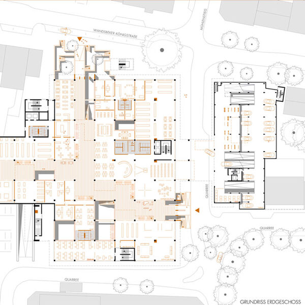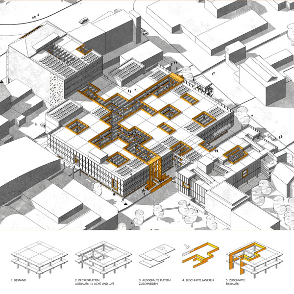 Das Karstadt-Kaufhaus in Wandsbek steht leer, ein Bebauungsplanverfahren ist eingeleitet und der Abriss einer ganzen Zeitschicht geplant. Dieser Entwurf untersucht, welches Potenzial in dem Gebäude steckt: Mit fokussierten, punktuellen Eingriffen wird das Gebäude zu einem hochwertigen und flexiblen Angebot für vielfältige Nutzungen. Der kleinere, ältere Gebäudeteil von 1924 ist ohne bedeutende Änderung weiter nutzbar, denn die historische Sandsteinfassade öffnet sich großzügig zur Wandsbeker Marktstraße. Der Hauptbestand aus den 1960er-Jahren soll jedoch abgebrochen werden. Dabei zeugt er mit seiner Kubatur und der charakteristischen Stahlbetonplatten-Fassade von architektonischen Ausdrucksformen und einer Einkaufskultur, wie sie es heute kaum noch gibt. Zudem reichen minimale Eingriffe unter Weiterverwendung bestehender Materialien, sodass die Umweltbelastung im Vergleich zu einem Neubau stark reduziert werden kann. Die bisherigen und geplanten Nutzungen können durch das Heraustrennen, Zuschneiden und Neuanordnen der Stahlbeton-Deckenplatten auch im Bestand untergebracht werden.