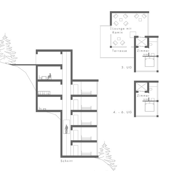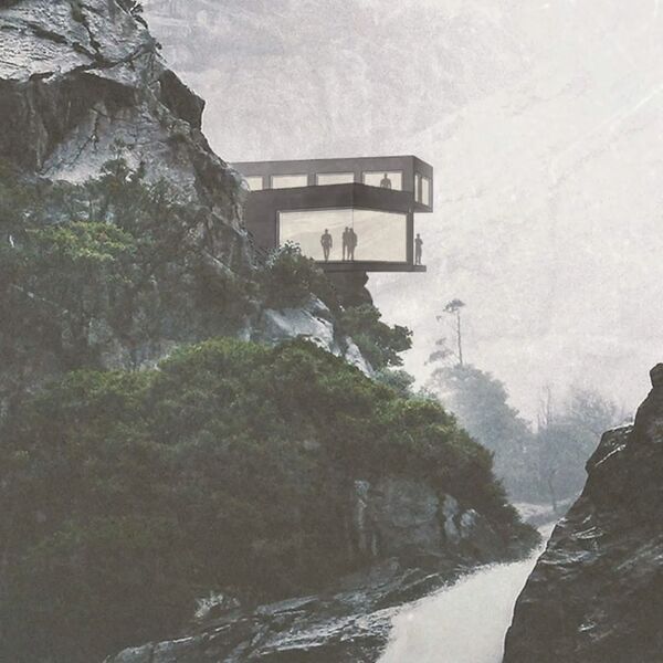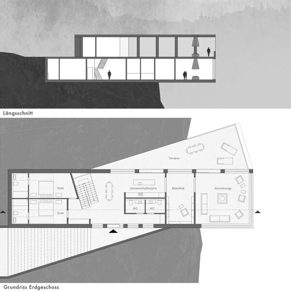Ausblick, Durchblick und spektakuläre Setzung an steilem Felshang sind der Rahmen und die Inspiration für den Entwurf. Als Baumaterial für die Primärkonstruktion sind Beton, Stahl oder Holz denkbar.