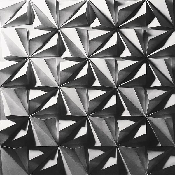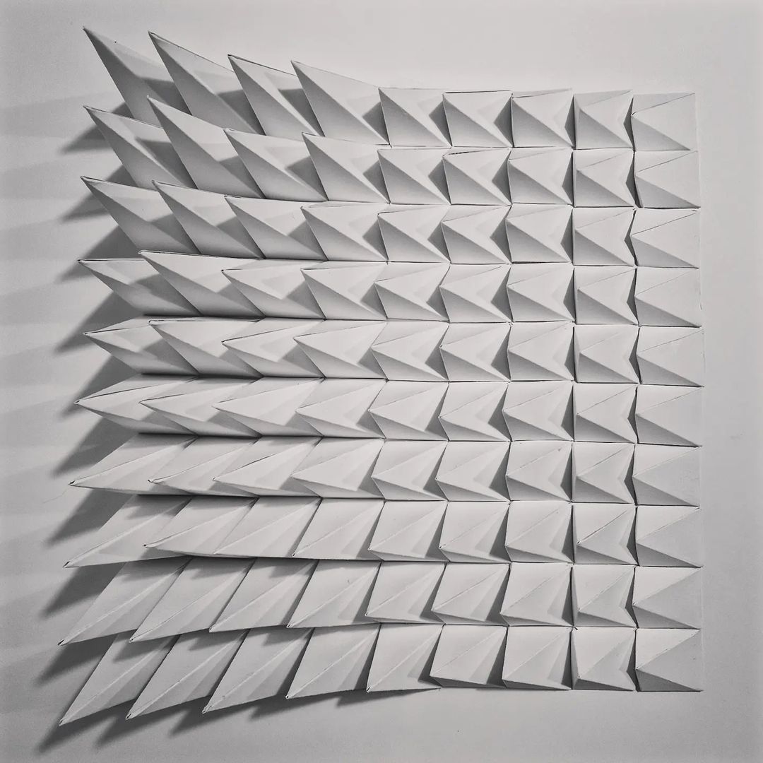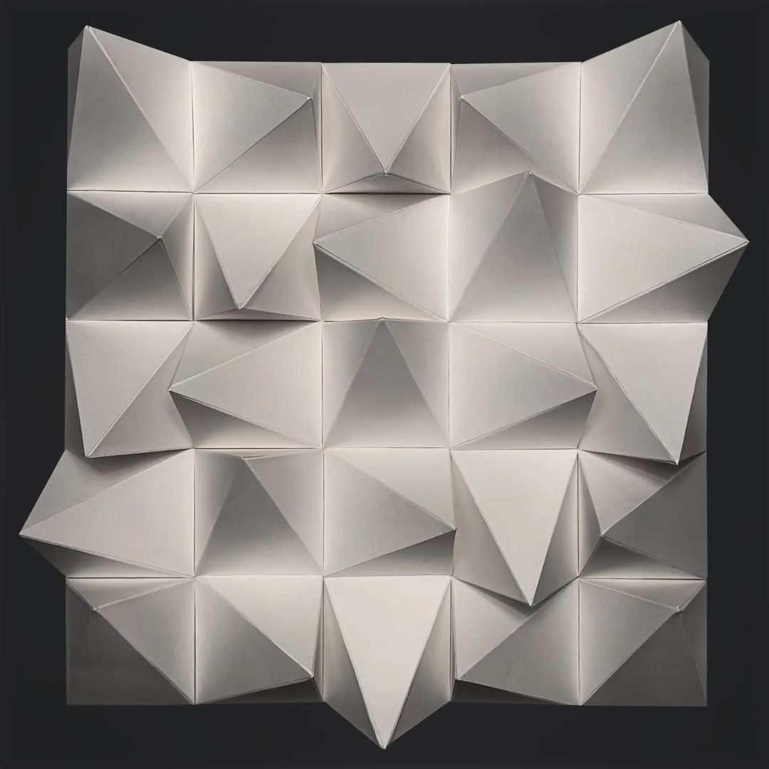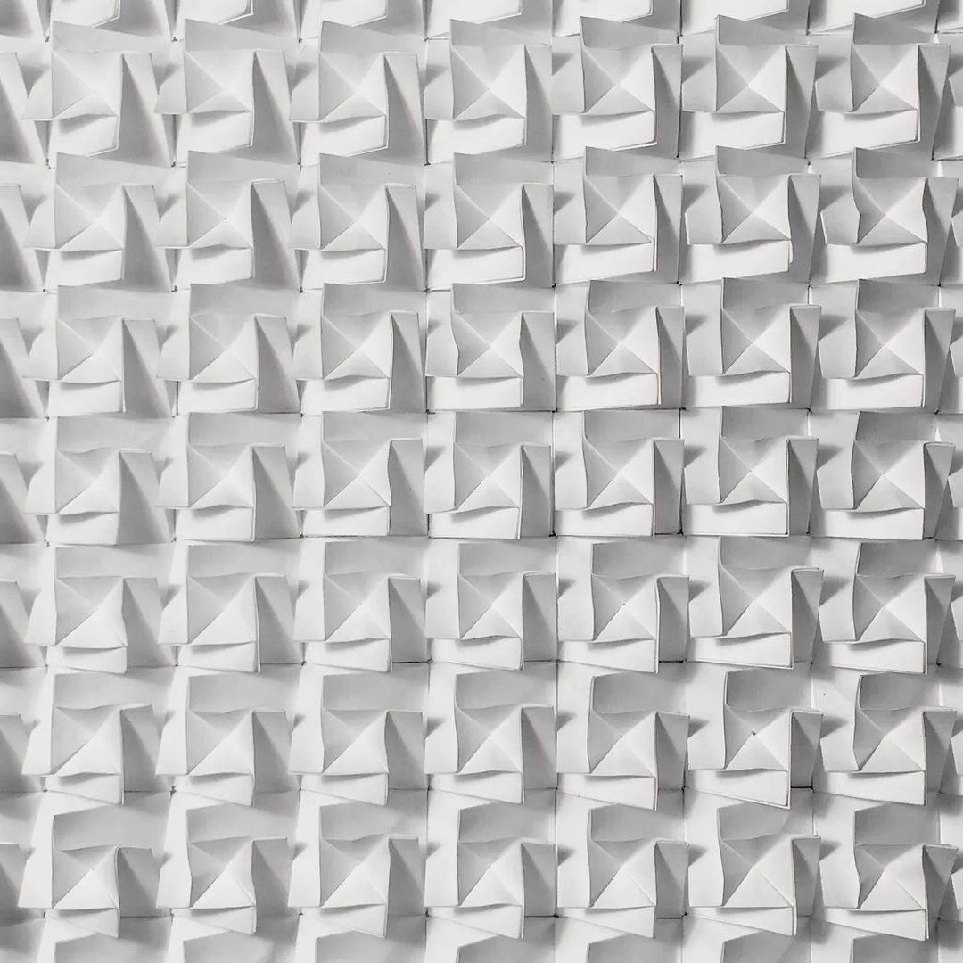 Entwurf einer Faltstruktur und Bau eines entsprechenden Papiermodells durch Erschaffung eines räumlichen Moduls und dessen bedachter Fügung zu einer reizvollen Gesamtkomposition mittels schneiden, falten und kleben.