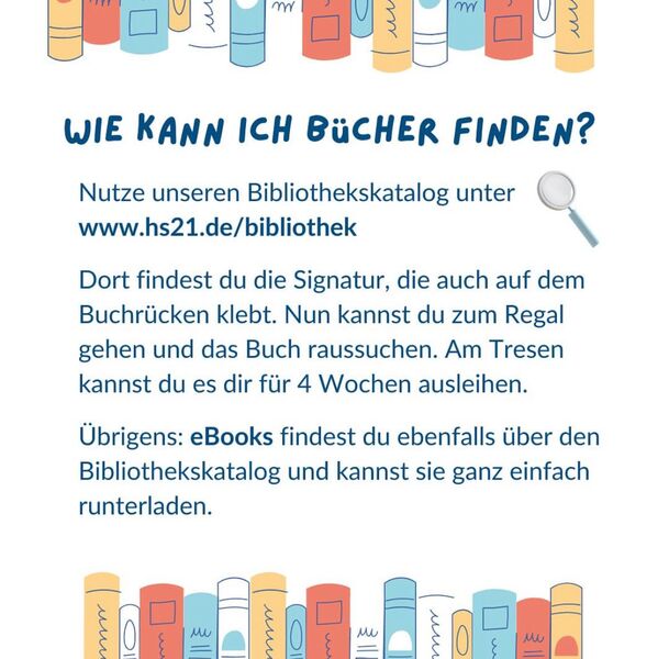 Unsere Serviceleistungen umfassen weiterhin die Teilnahme an der Fernleihe, die Bereitstellung von Zugängen zu E-Books, Online-Zeitschriften und Online-Datenbanken. Mit der Nutzung der Bibliothek erkennen Sie die Benutzungs- und Gebührenordnung für die Bibliothek der hochschule 21 an.