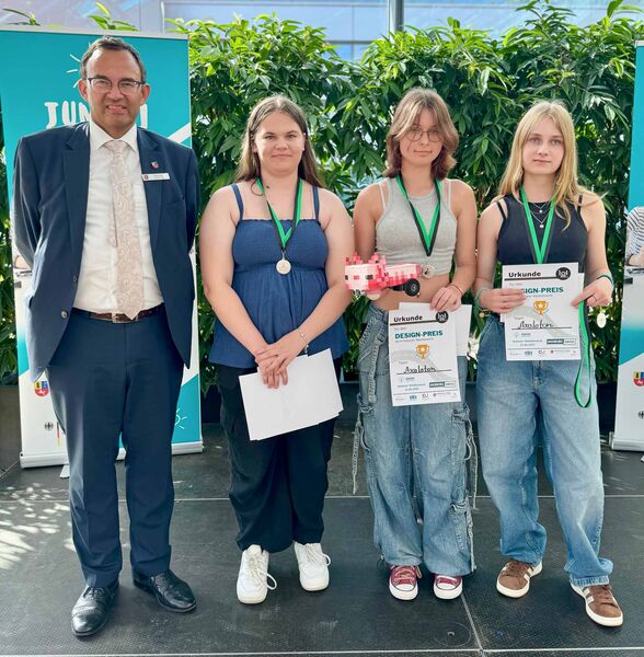 Doch nicht nur die reine Performance wurde prämiert, auch die Aspekte Nachhaltigkeit und Design spielten eine Rolle. Deshalb durften die „ProMint Profis“ ein zweites Mal auf die Bühne, um den Umweltpreis in Empfang zu nehmen. Die fachkundige Jury, vertreten durch den Ersten Kreisrat Thorsten Heinze, lobte in ihrer Begründung den sparsamen Materialeinsatz und die Verwendung biologisch abbaubarer Baustoffe.