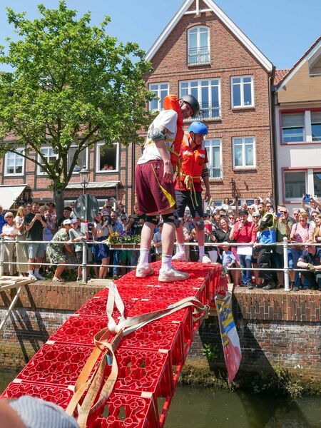 Eine erfrischende Abkühlung gab es für die Studierenden der hochschule 21 am vergangenen Samstag: Mit ihren selbstgebauten Brücken über den Fleth gingen sie im wahrsten Sinne des Wortes baden. Bereits zum zehnten Mal fand das Sommerbrücken-Event in der Buxtehuder Altstadt statt, für das die mehr als 100 Studierenden aus innovativen Materialien eine Brücke bauen sollten. Das Ziel: Zwei Personen müssen sich in der Mitte begegnen, ohne dass das Bauwerk zerbricht. Erst beim Betreten einer dritten Person soll sie kaputt gehen.