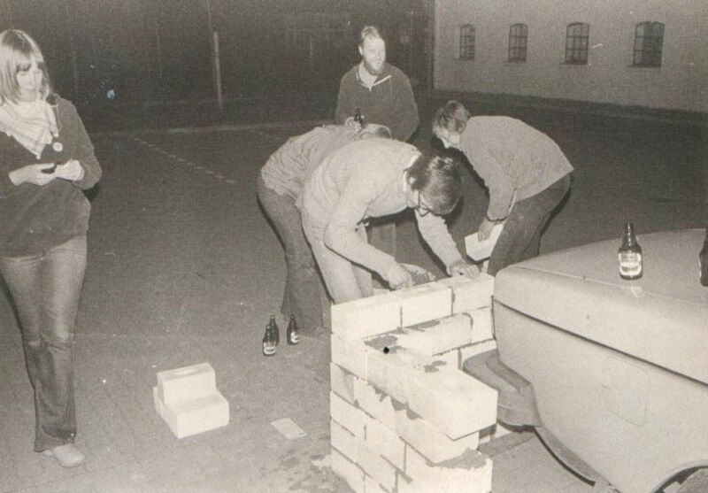 Dazu wurden in einer „Nacht- und Nebelaktion“ ca. 90 Kalksandsteine (2DF und 3DF), eine Bütt mit bereits angerührtem Mörtel, drei Maurerkellen und eine nicht bekannte Anzahl von Bierflaschen auf den Parkplatz der Fachhochschule transportiert, um in Windeseile den Mauerbau durchzuführen.